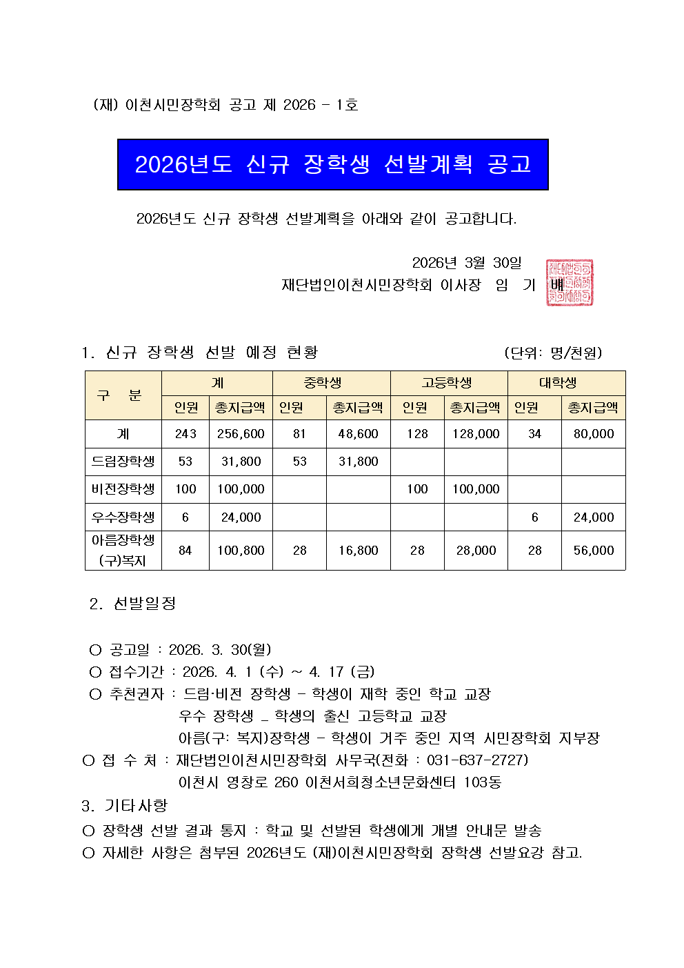 2026년 신규 장학생 선발 계획 공고