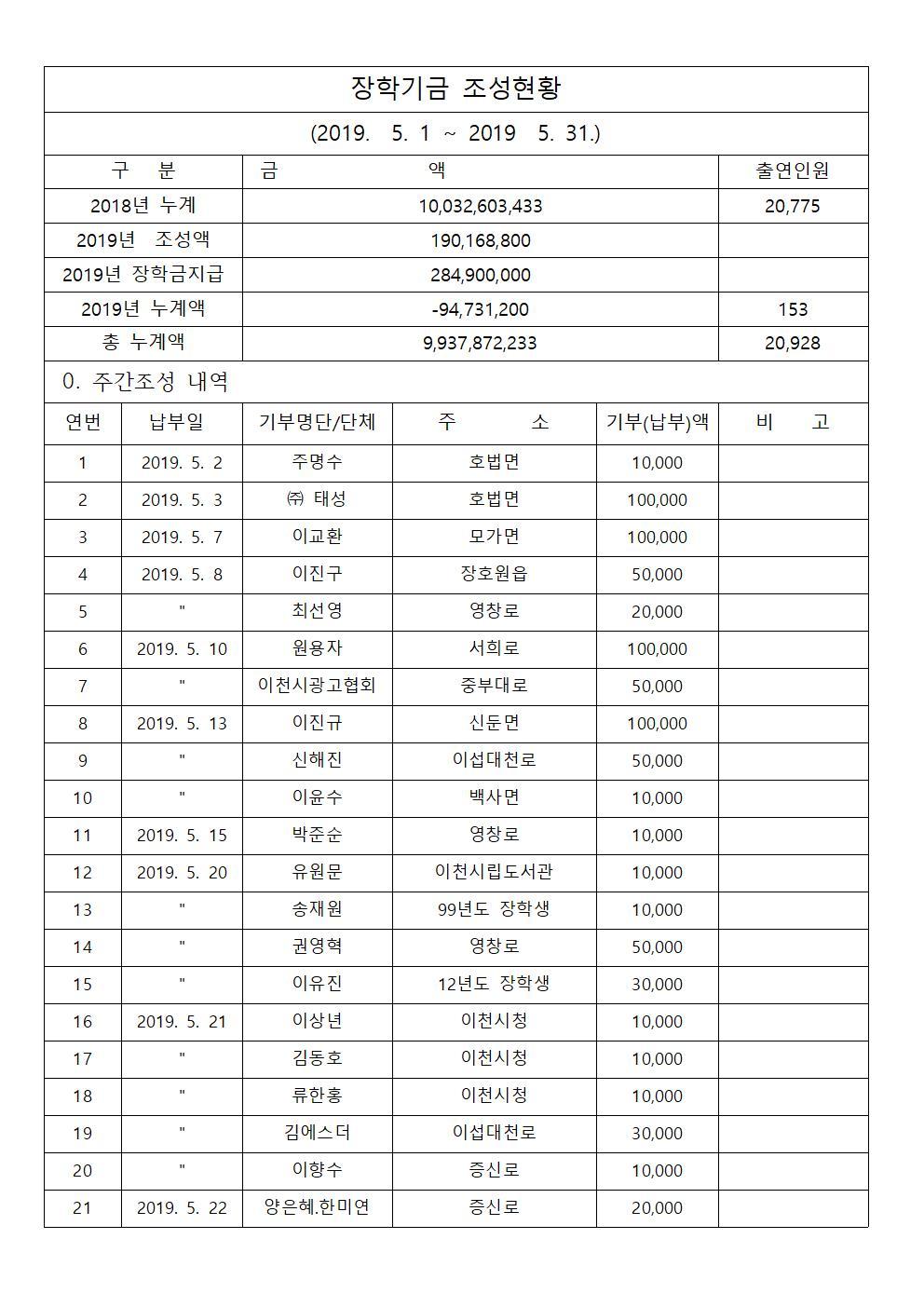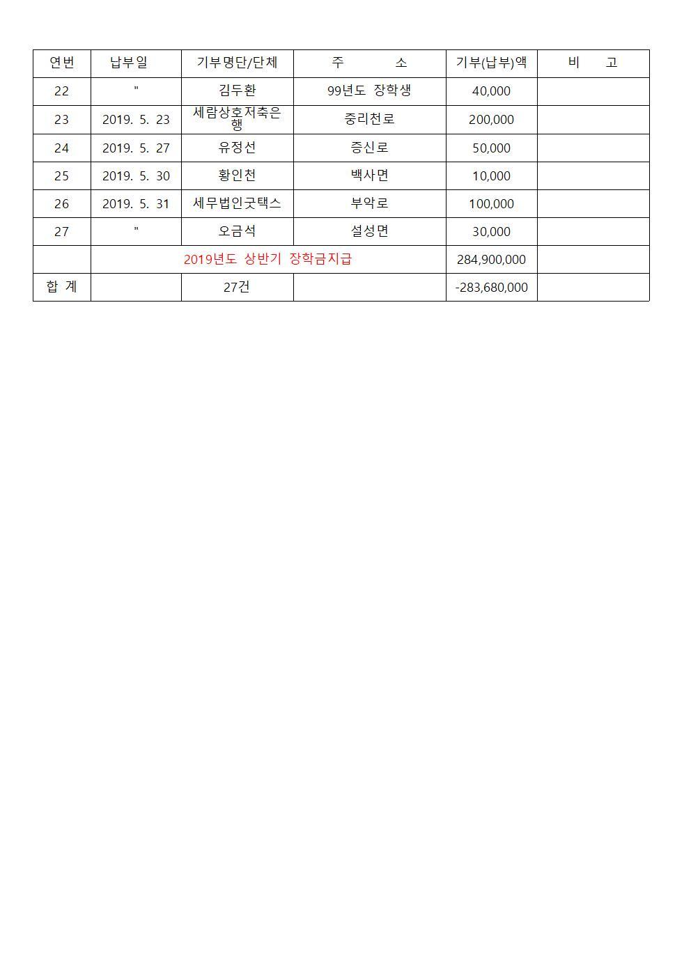 2019년 5월 장학기금 출연자 명단
