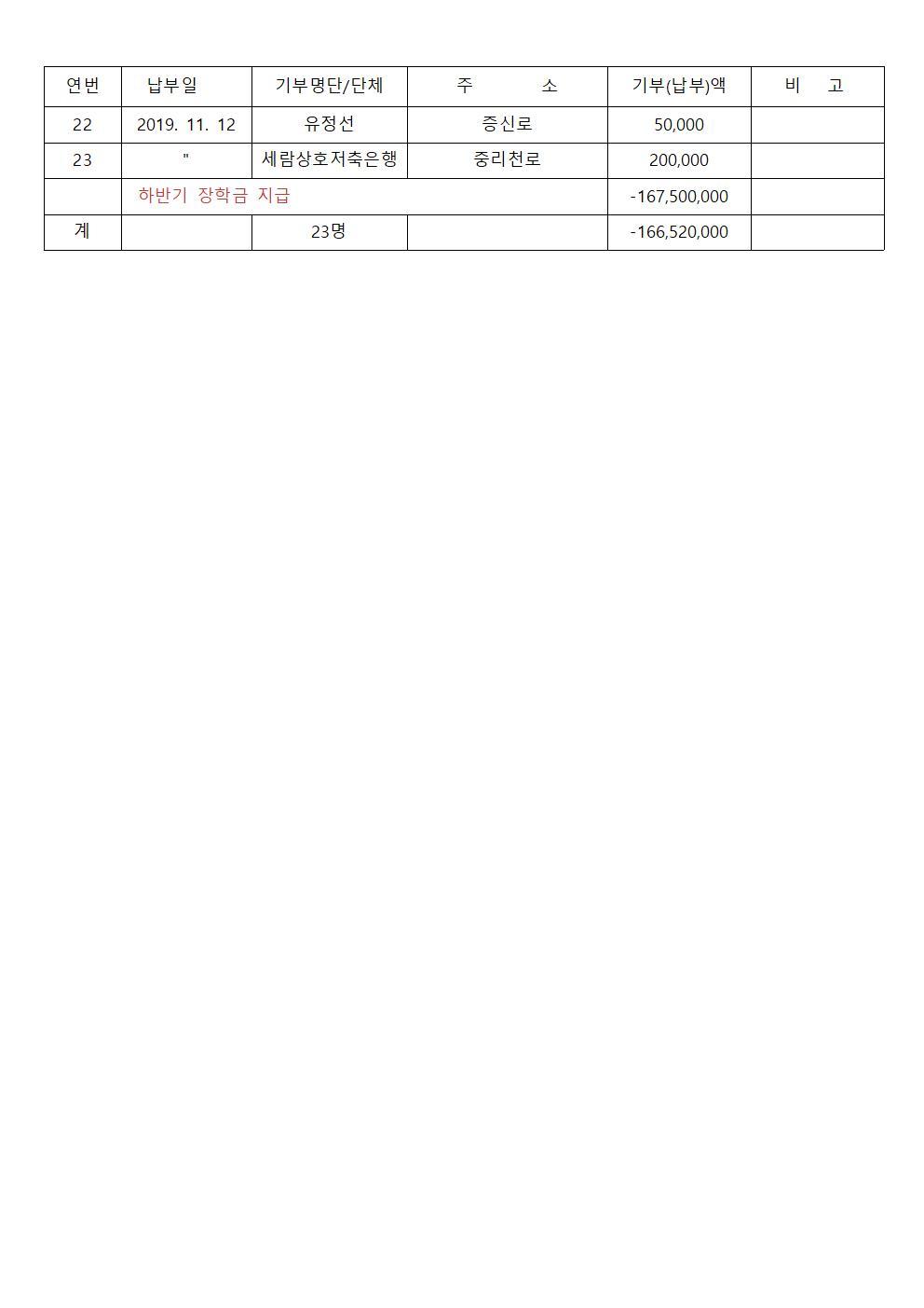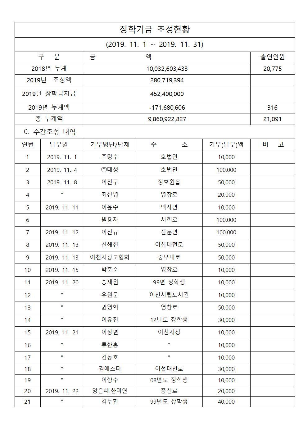 2019년 11월 장학기금 출연자 명단